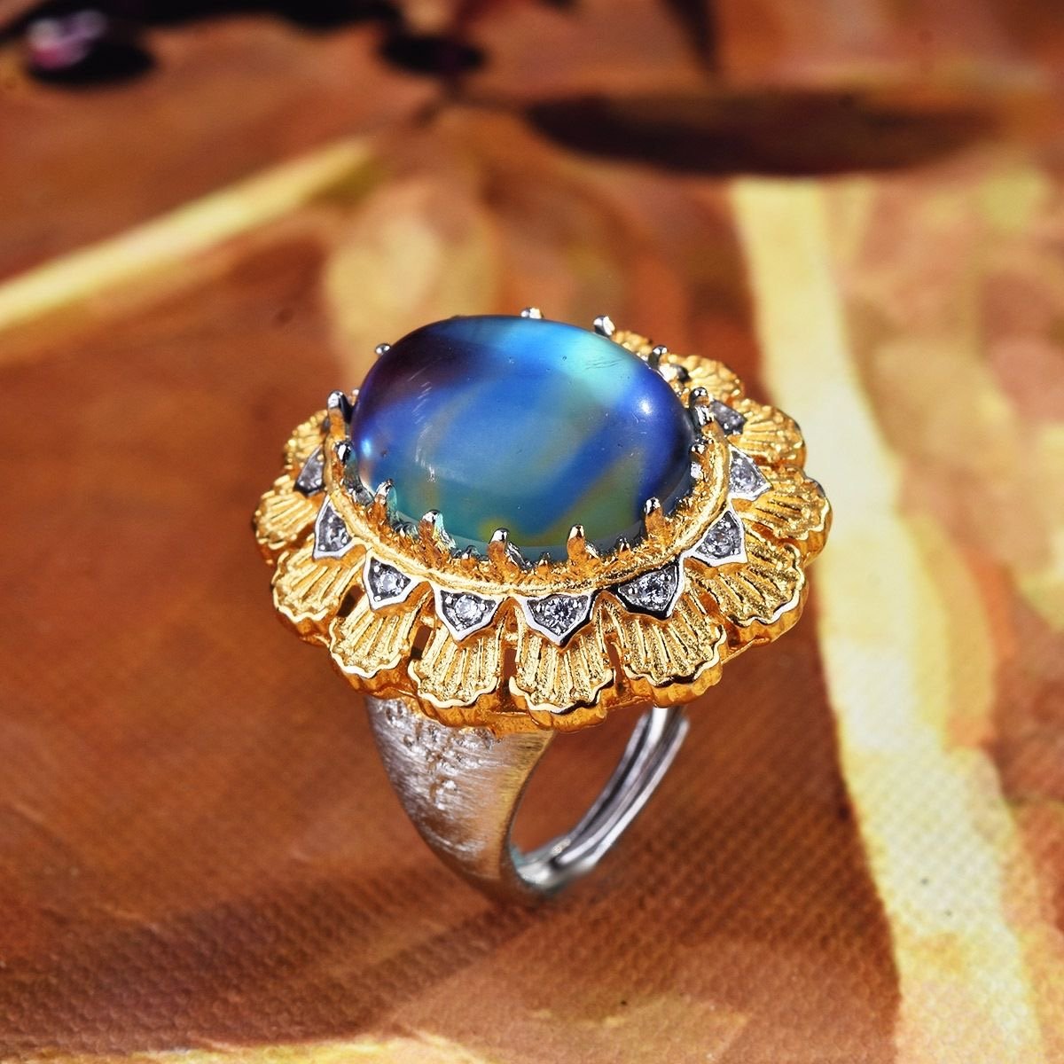 Carved gold hand-drawn moonstone French antique two-color gold lace ring quantity