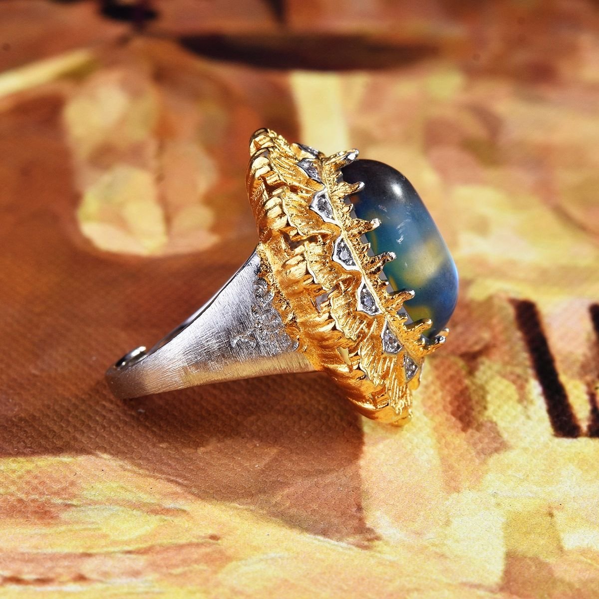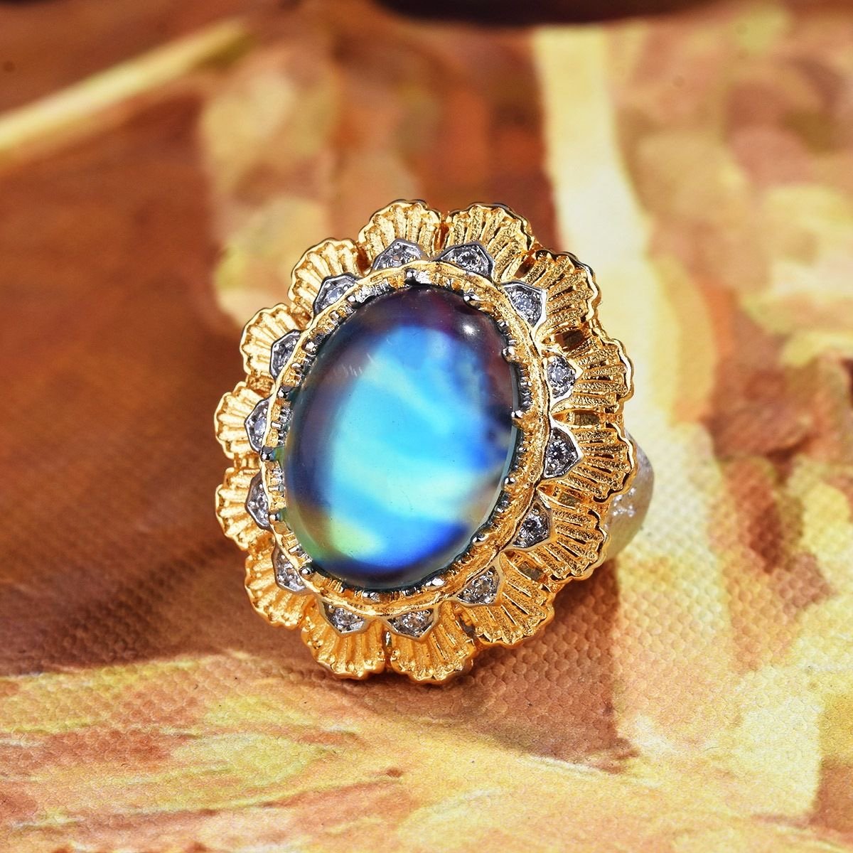 Carved gold hand-drawn moonstone French antique two-color gold lace ring